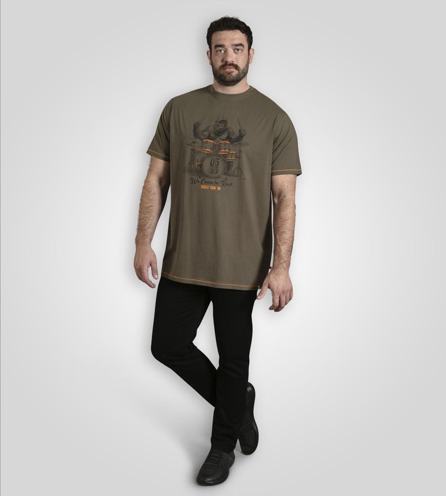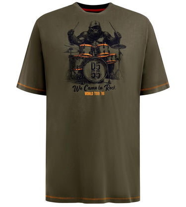 Make a bold statement with the D555 STOCKTON Gorilla Playing Drums Printed Crew Neck T-Shirt. This khaki t-shirt features an eye-catching graphic of a gorilla rocking the drums, perfect for music lovers and those who enjoy quirky, fun fashion. Crafted from 100% pure cotton, it provides softness, breathability, and all-day comfort. Whether you're hitting a gig, chilling with friends, or just love standout prints, this tee is a must-have.