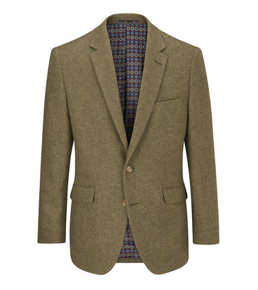 Hexham Men’s Sage Wool Blend Tweed Effect Jacket. Crafted from a premium 80% polyester and 20% wool fabric, this tailored fit blazer combines the rich texture of tweed with the comfort and durability of a modern blend.