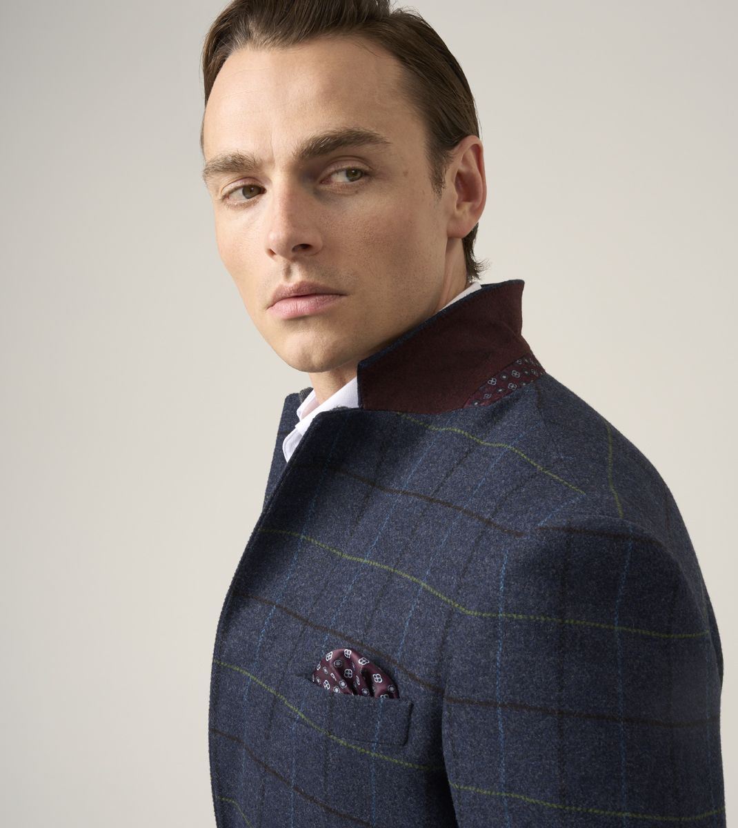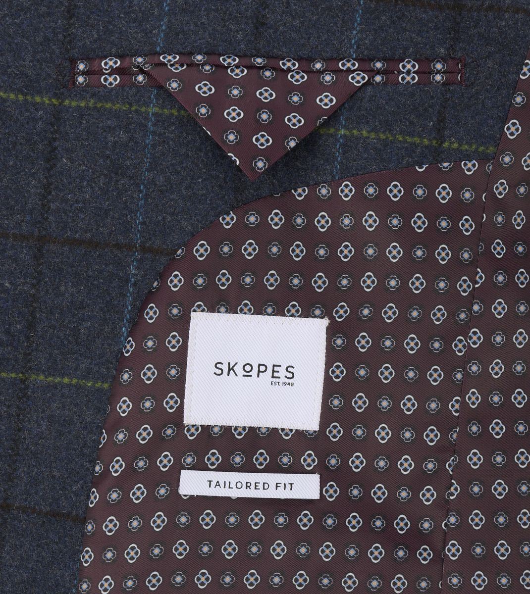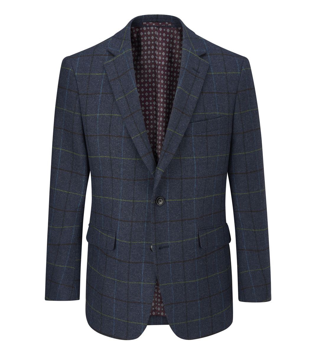 Designed with attention to detail, it features notch lapels, lower waist flap pockets, and a pull-out pocket hankie for a polished finish. The dark gloss buttons and geometric print lining add a distinctive character, while twin side vents ensure ease of movement and comfort throughout the day.
