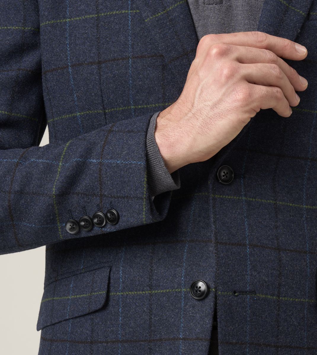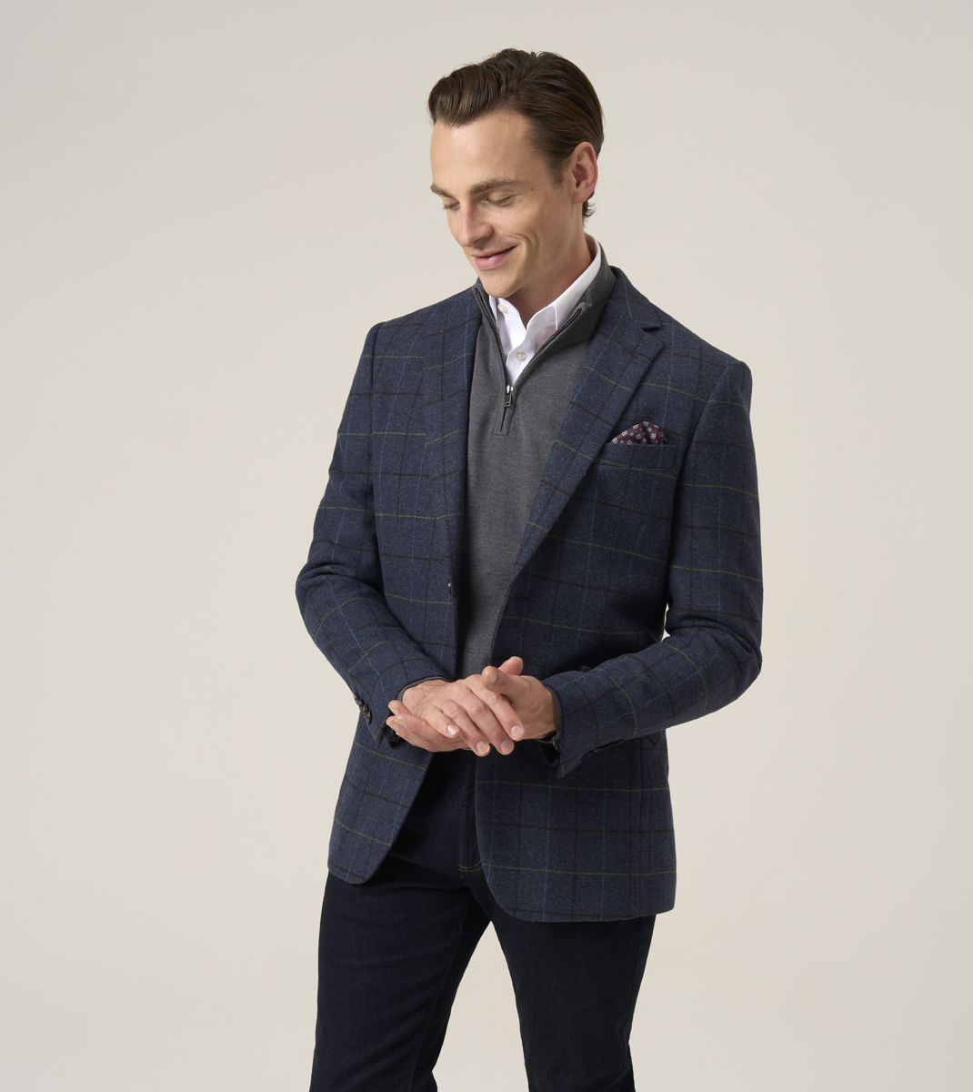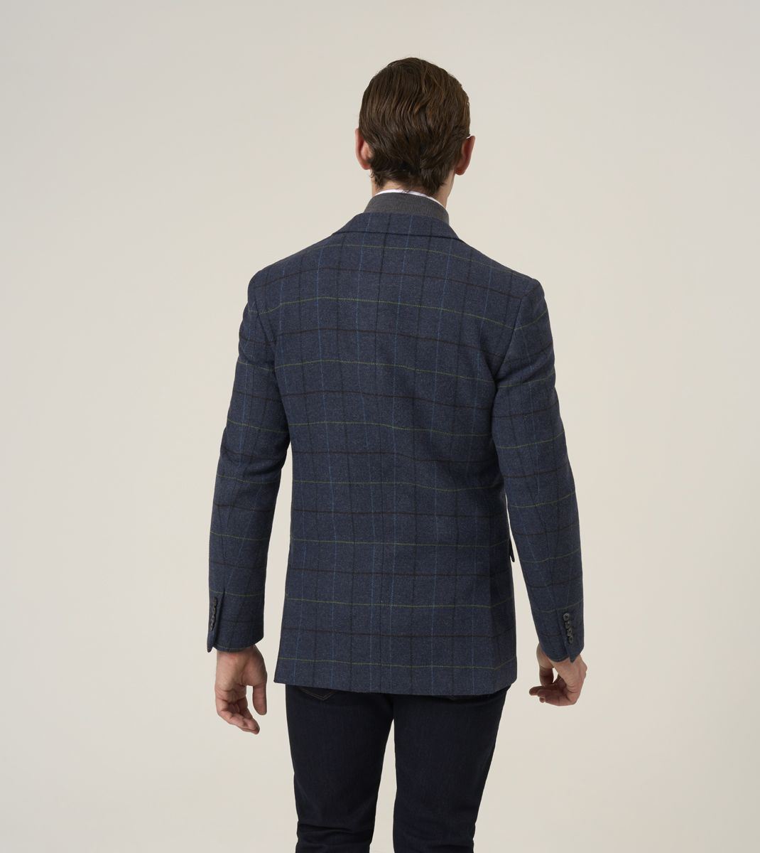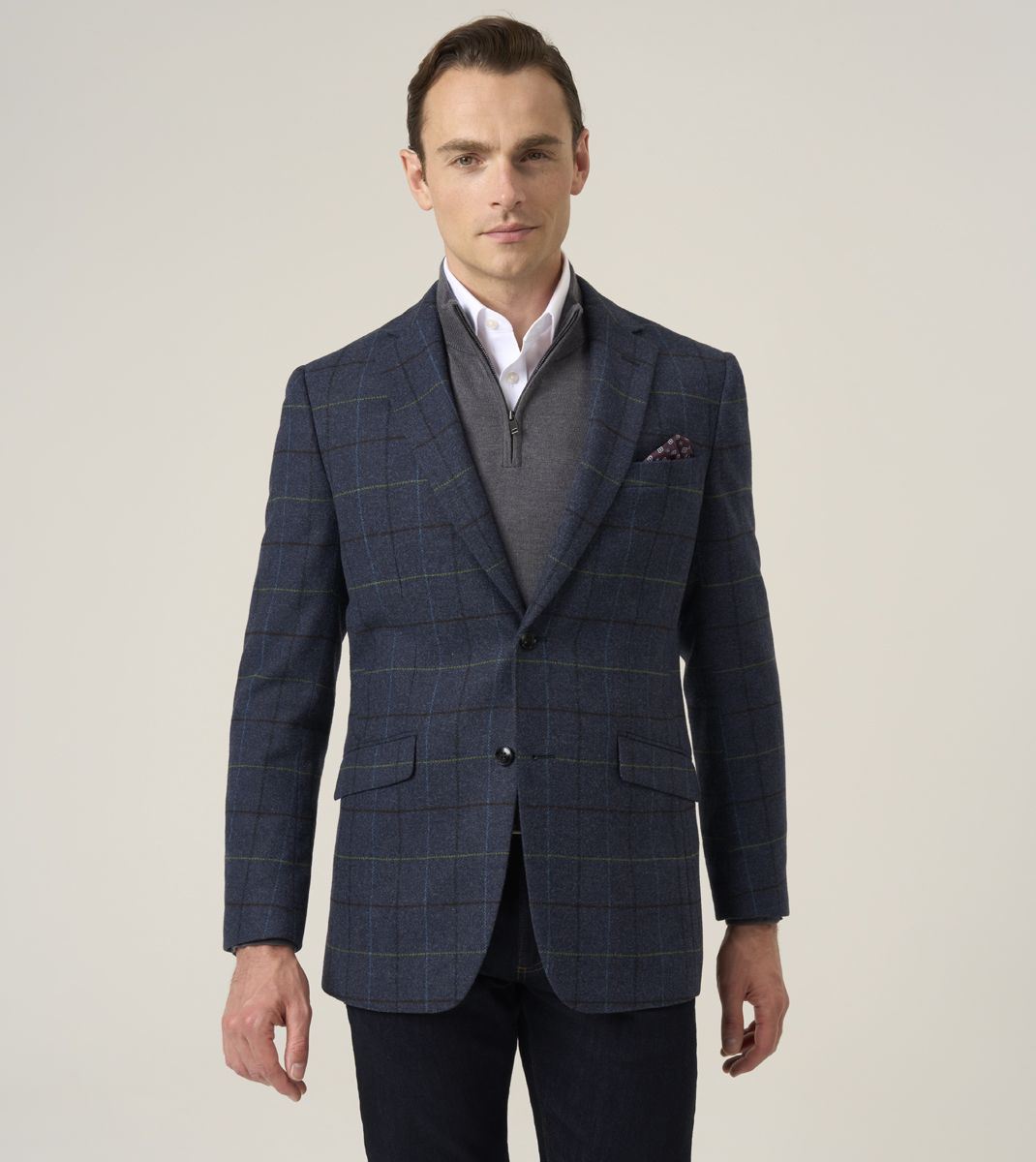 Ryedale Men’s Navy Check Wool Blend Jacket. Crafted from a premium 70% polyester and 30% wool blend, this tailored fit blazer combines classic British style with modern comfort. The navy check pattern adds a refined touch, making it perfect for both formal occasions and smart-casual wear.