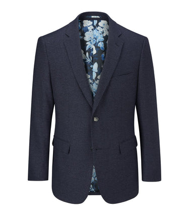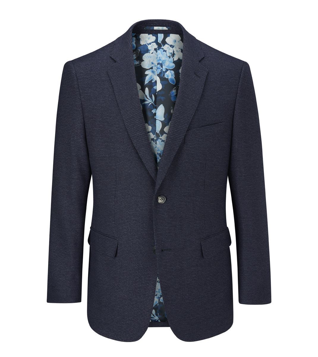Features include flap pockets, floral print lining, horn effect buttons, pull out hankie with twin side vents.